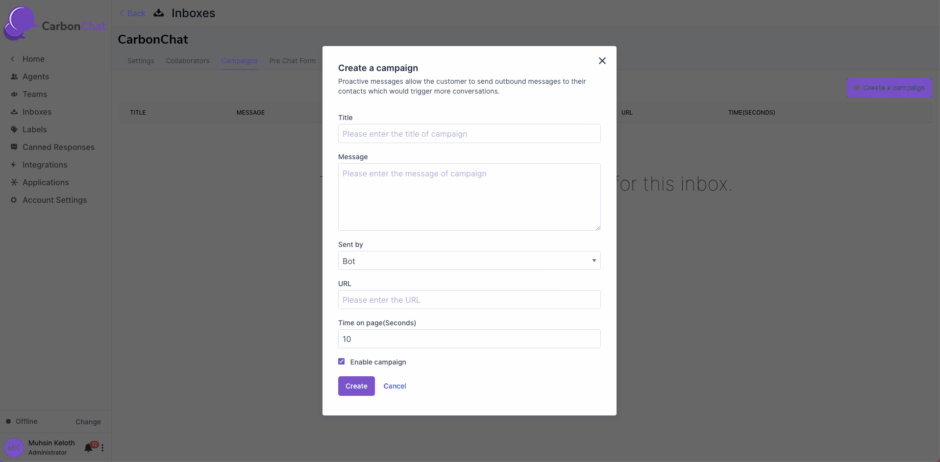 Step 2. Click on the "Create a campaign" button., it will display a modal where you can input the campaign details.