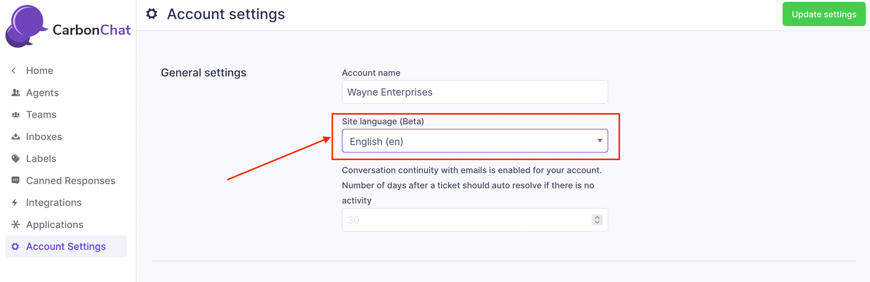 Note: Changing the language as per the above instruction would change the default language for all agents/administrators in the system. At the moment, CarbonChat does not support language selection at the agent level. Also, note that this language would be used as the fallback language for the live-chat widget.