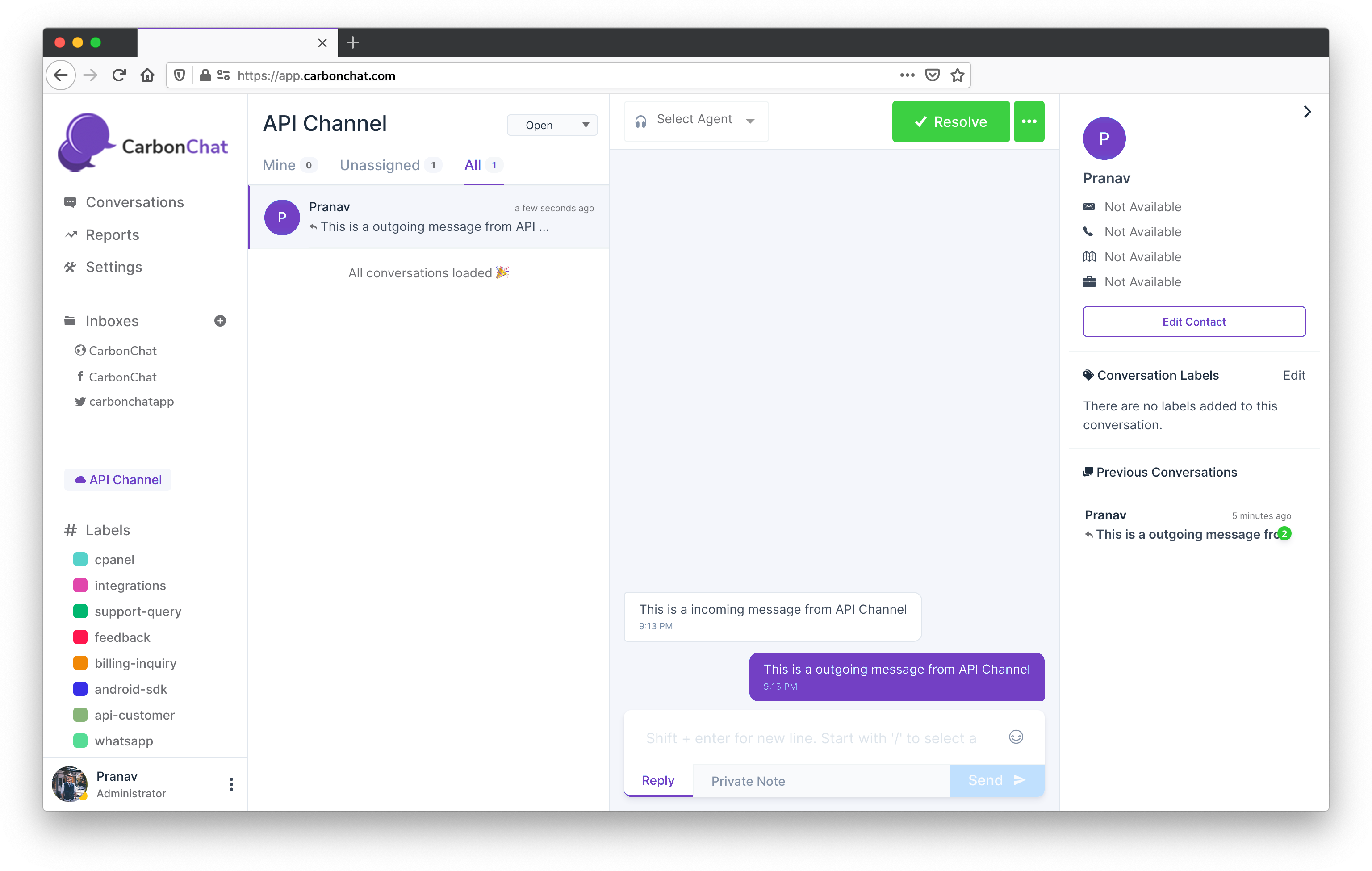 - Inbox: You can create multiple sources of conversations which is of the same channel type. For eg: You can have more than one Facebook page connected to a CarbonChat account. Each page is called as the inbox in CarbonChat.