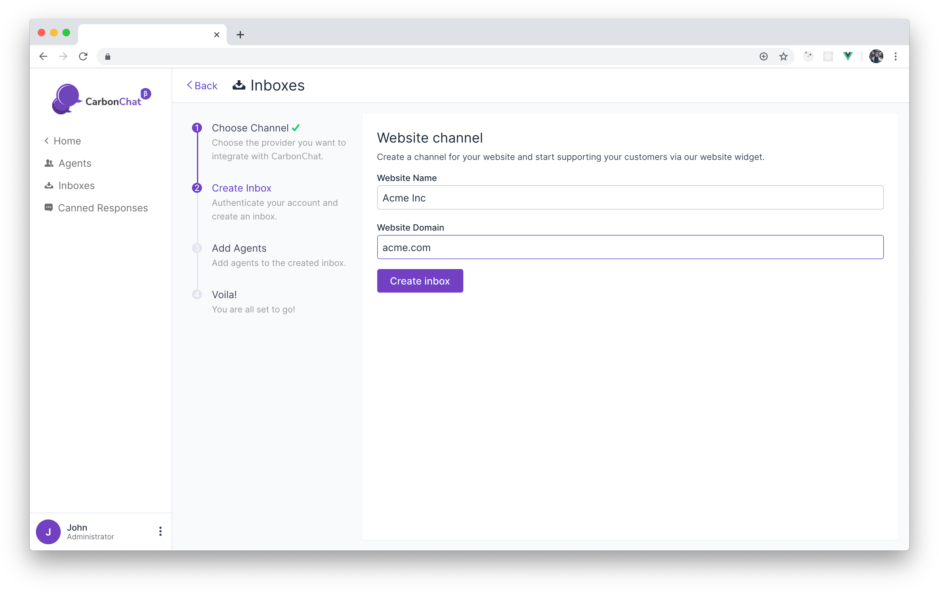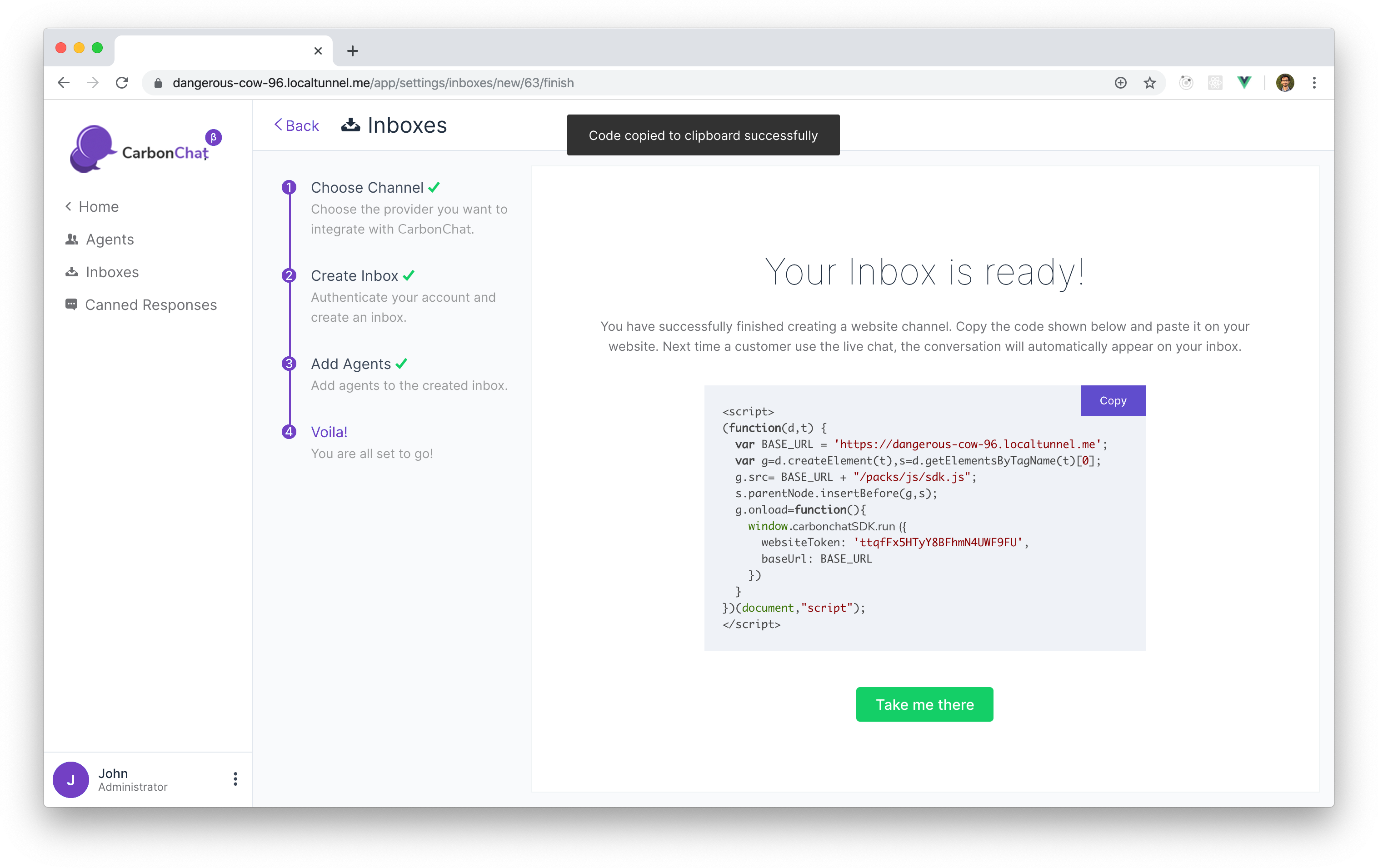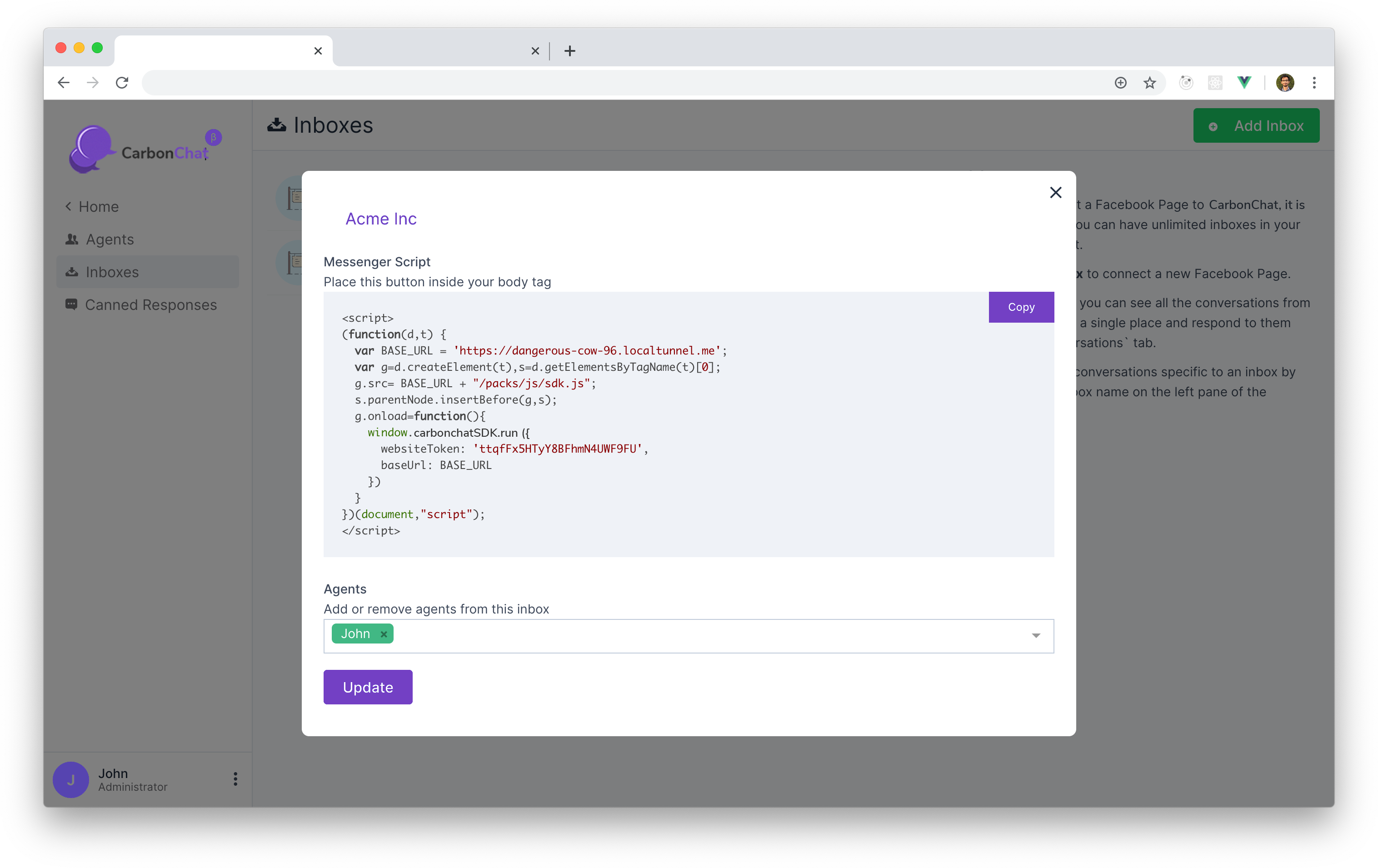 Step 6. If you want to update the agents who have access to the inbox, you can go to Settings > Inboxes. You will be able to see your website inbox listed there. Click on Settings. You will be able to see the code as well as the list of agents who have access to the inbox.