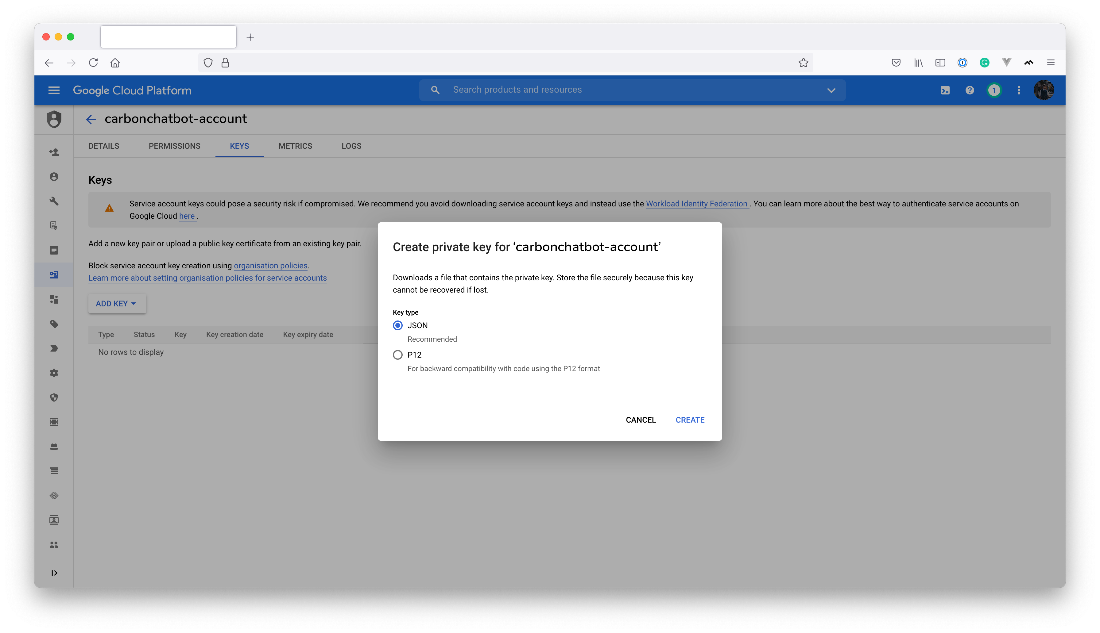 Continue and click on "Done". Now, you would be able to see the service listed in the dashboard. The next step is to create a key so that it can be shared with CarbonChat. Click on the service account and click on the "Keys" tab. Then, click on "Add Key". You will be able to see a screen like the one below.