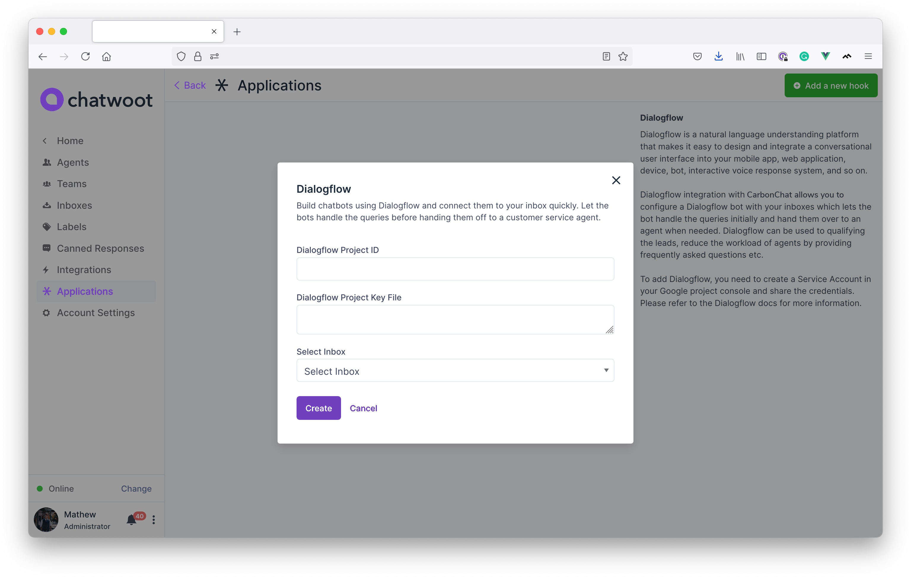 CarbonChat has a native Dialogflow integration. Go to "Settings -> Applications -> Dialogflow". Click on "Configure", you will see a button to "Add a new hook".