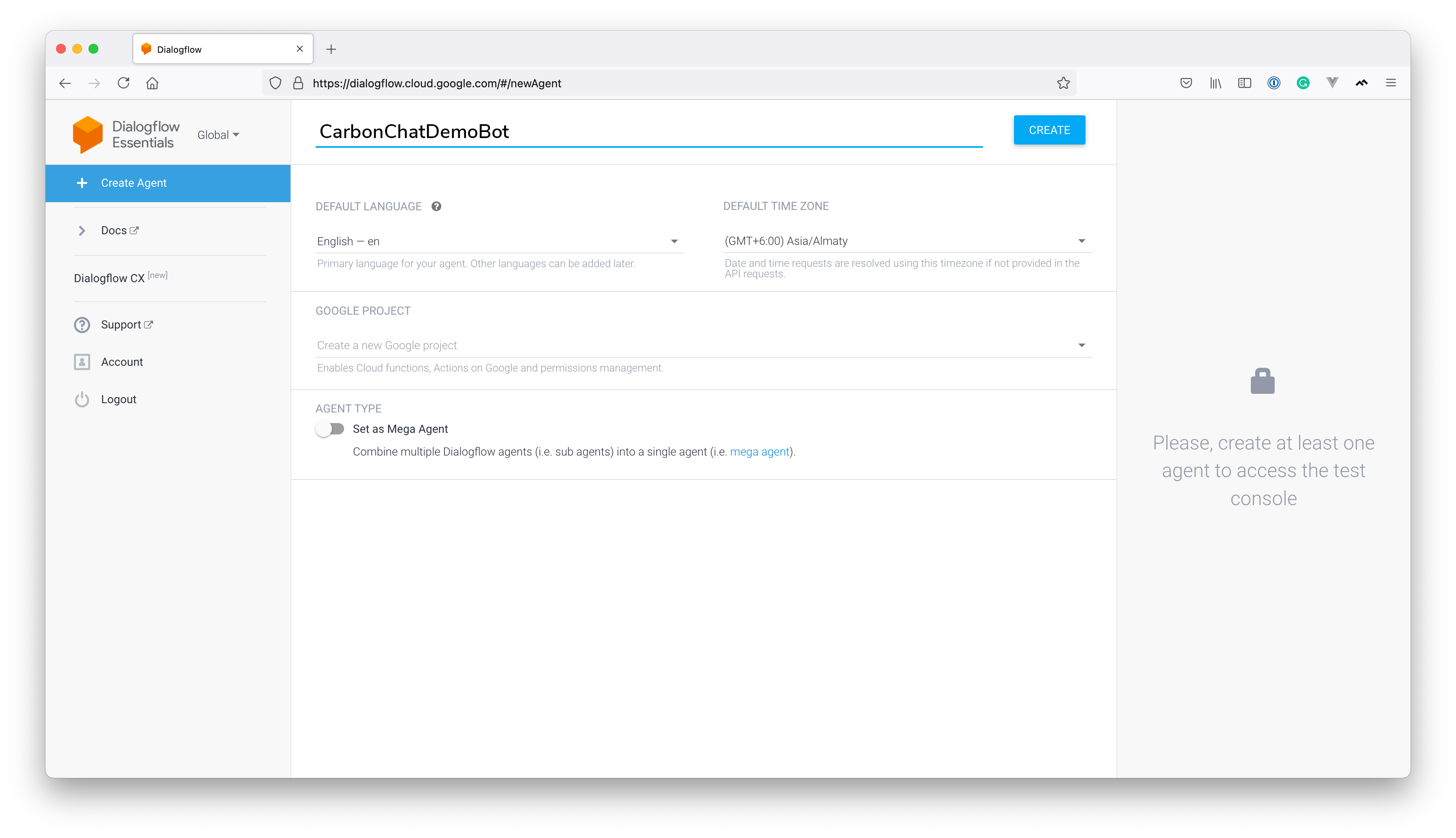 Go to Dialogflow Console. (opens new window) Click on "Create new agent". It would show options as shown below.
