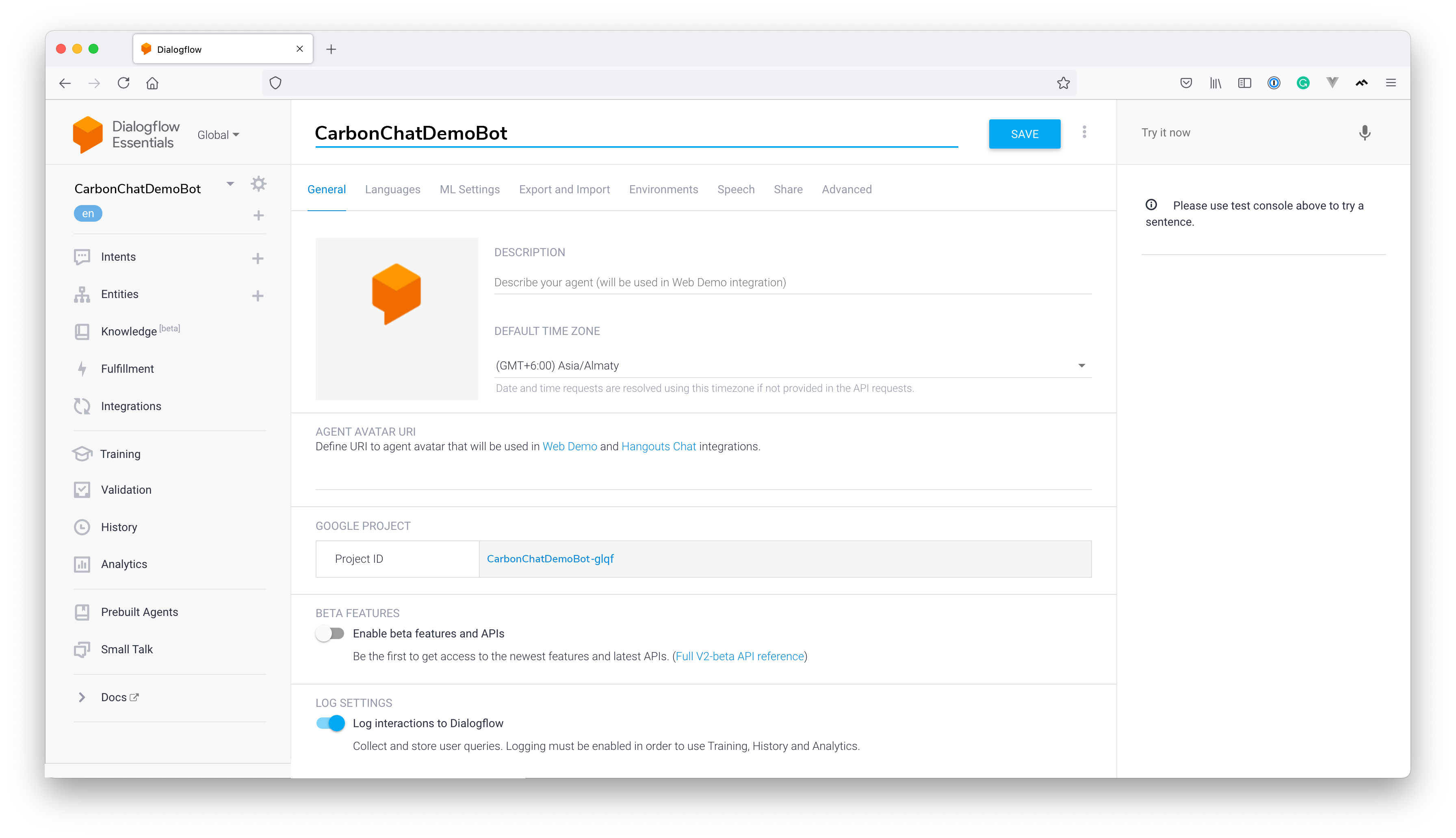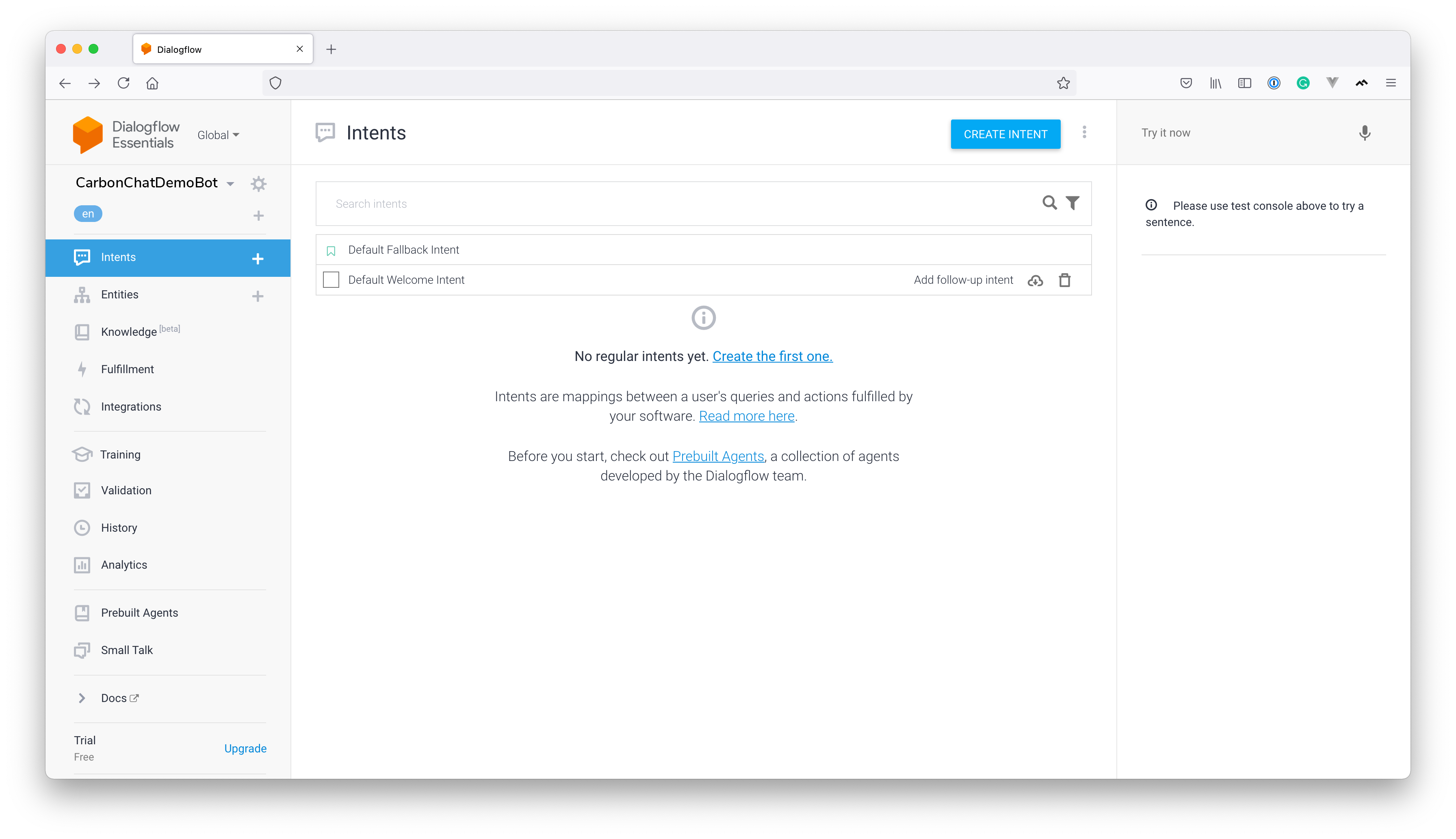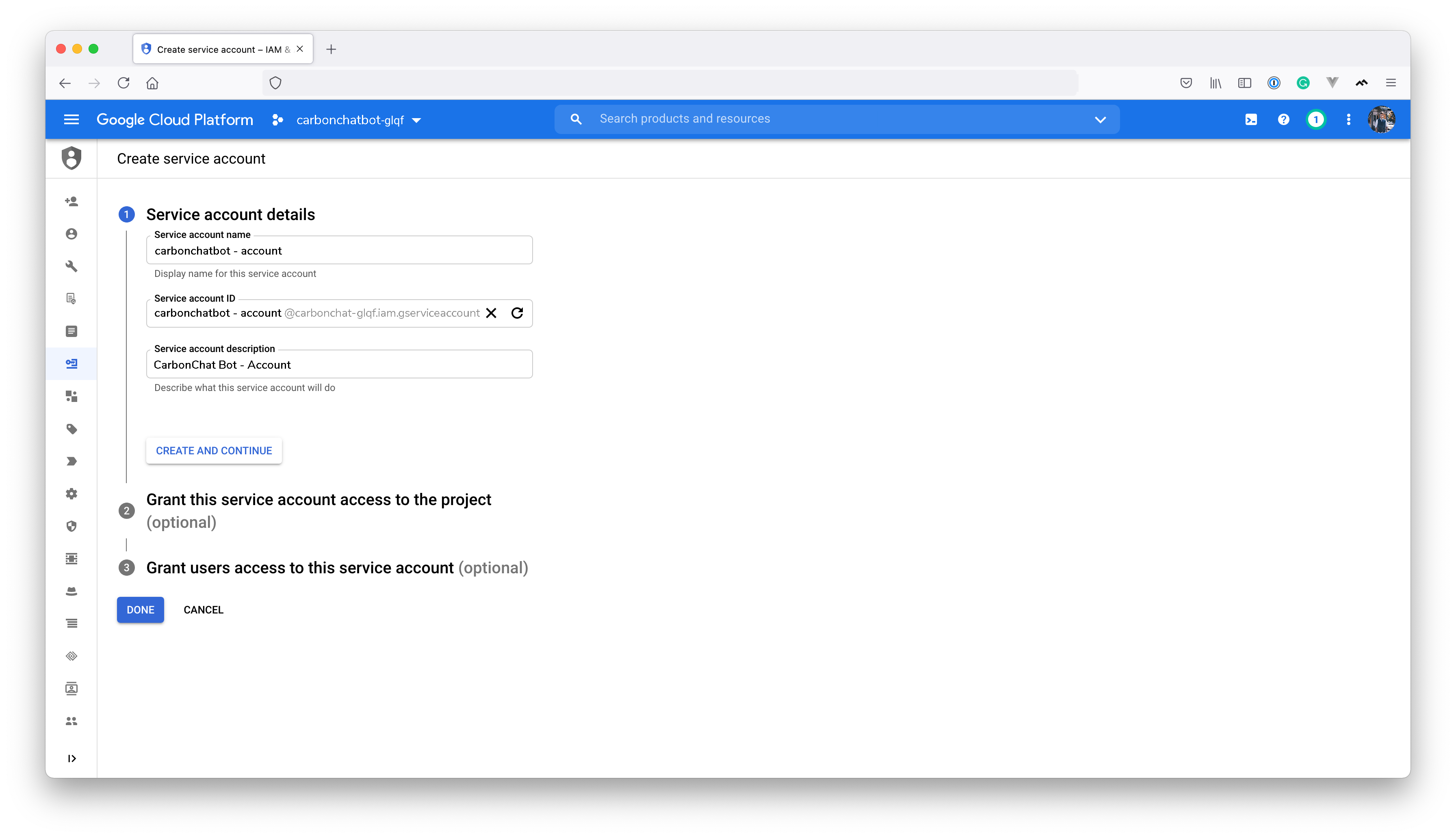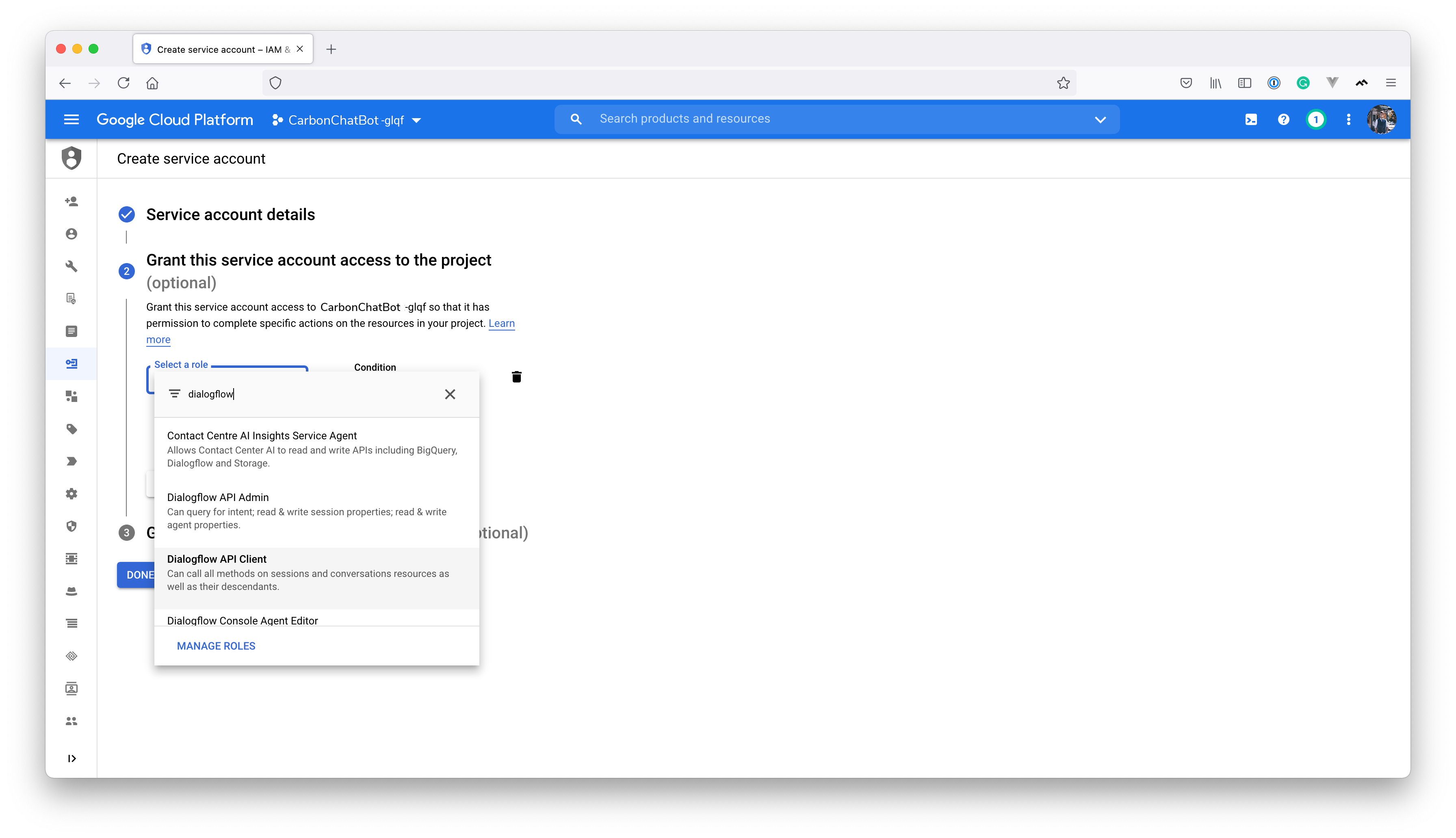 Now a basic bot configuration is complete, let us create a service account and connect it with CarbonChat.