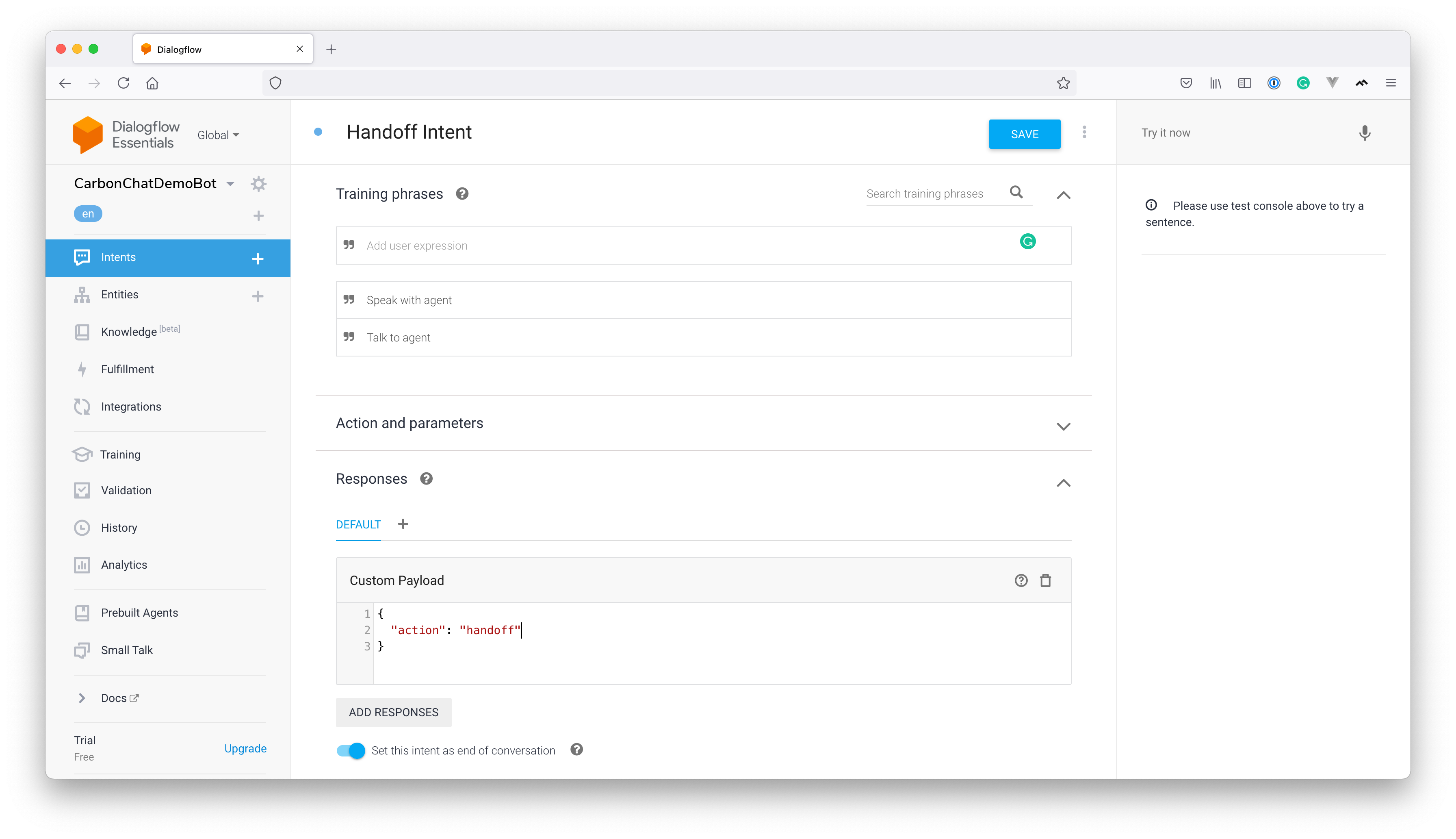 Create an intent named "Handoff Intent" with training phrases like "Talk to an agent" or "Speak with an agent", etc. To handle the handoff intent, we will create a "Custom Payload" response as shown below.