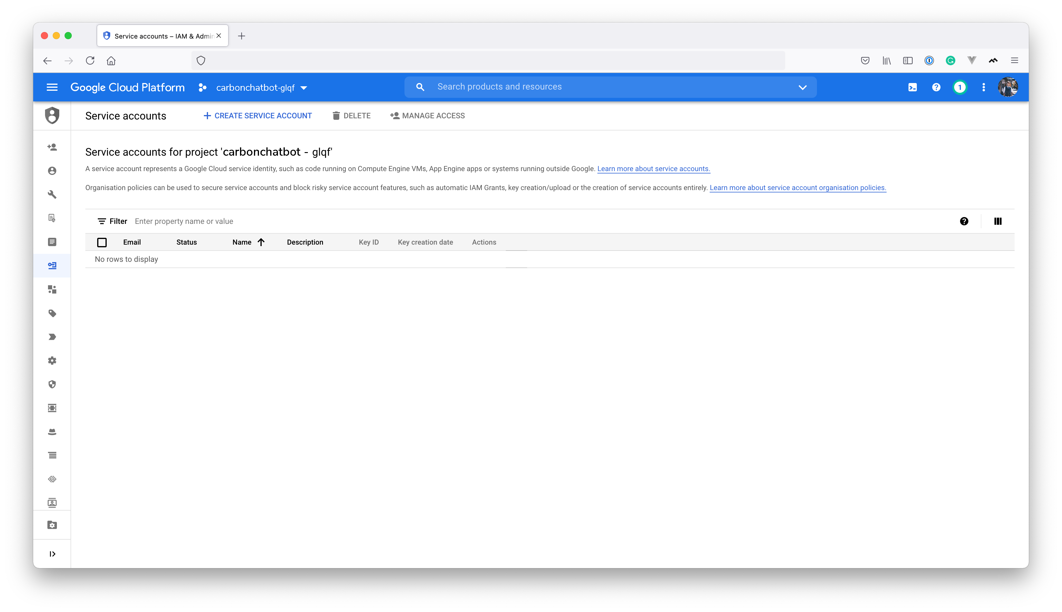 Navigate to IAM & Admin -> Service Accounts. You will see a view like the one below. Click on "Create Service Account".