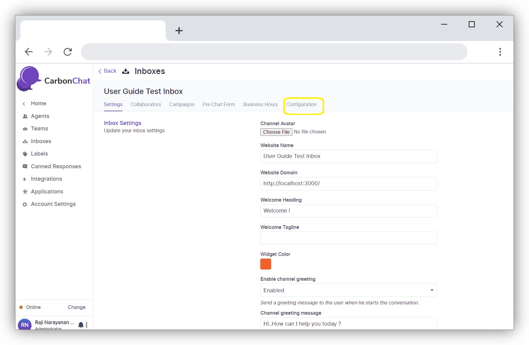 Click on the CarbonChat Widget on the screen. Chat Screen opens up like below. A chat window with the colour you selected, Welcome Tag Line you gave and Welcome Message you have given will open up. Customers will see this Chat window on their screen.