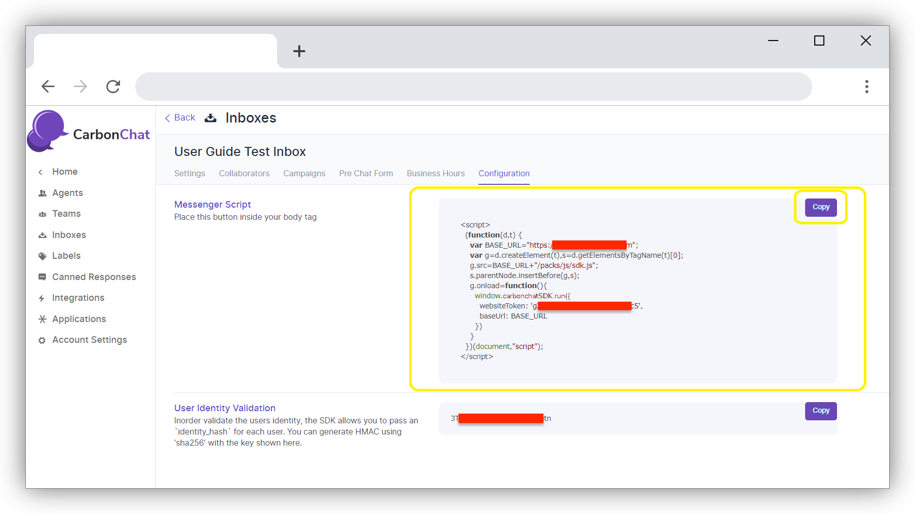 Click on Configuration tab. The code snippet to be copied to the website will appear here.